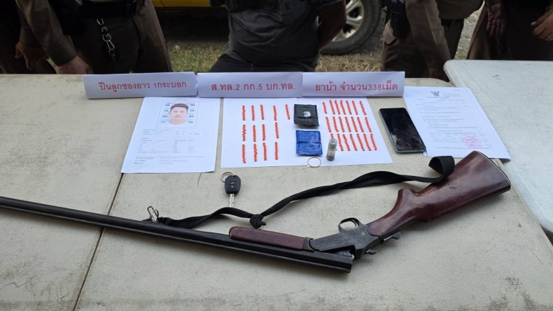 จากการตรวจค้นพบยาบ้าจำนวน 338 เม็ด ลักษณะเม็ดกลมแบน สีส้ม ประทับอักษร “WY” บรรจุในซองพลาสติกสีดำและสีน้ำเงินแบบกดเปิดปิด ซ่อนอยู่ในกระเป๋ากางเกงยีนส์ที่ผู้ต้องหาสวมใส่ จากนั้นตรวจค้นภายในรถ พบอาวุธปืนลูกซองยาว หมายเลข 17784 พร้อมกระสุนขนาดเบอร์ 12 จำนวน 1 นัด แขวนอยู่หลังเบาะนั่งผู้โดยสารด้านหน้า และวางกระสุนไว้ที่ช่องวางแก้วน้ำบริเวณกลางรถ