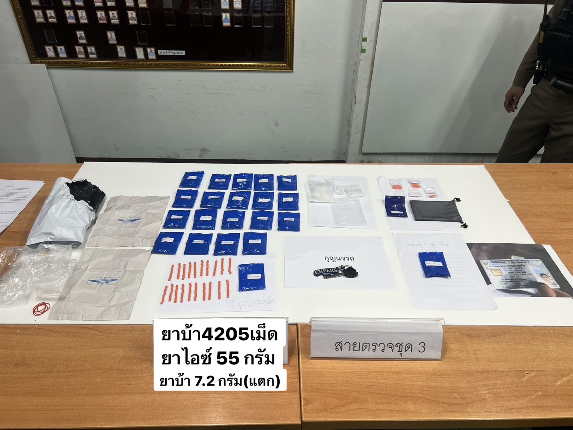 ของกลางที่ตรวจยึดได้ประกอบด้วย ยาบ้าจำนวนกว่า 4,000 เม็ด ยาไอซ์น้ำหนักรวมกว่า 50 กรัม รถจักรยานยนต์ที่ใช้ในการกระทำความผิด และเอกสารผลตรวจสารเสพติด เจ้าหน้าที่จึงควบคุมตัวผู้ต้องหานำส่งโรงพยาบาลเพื่อรักษาอาการบาดเจ็บและตรวจหาสารเสพติด ก่อนนำตัวส่งพนักงานสอบสวนดำเนินคดีตามกฎหมาย