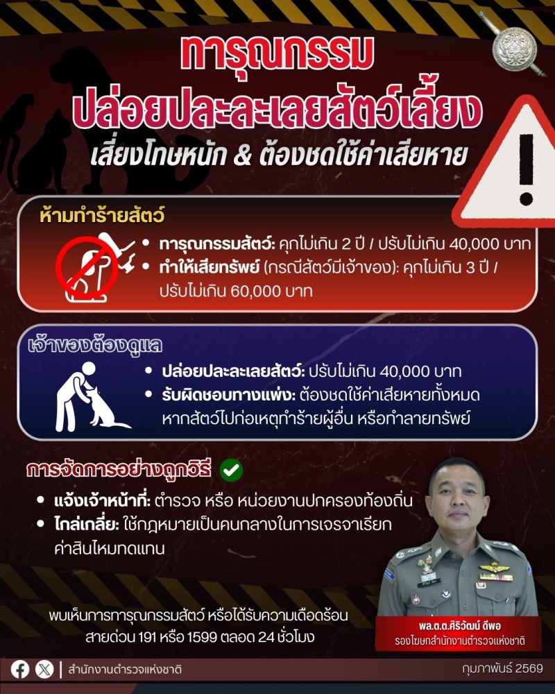 วันนี้ (24 กุมภาพันธ์ 2569) พล.ต.ต.ศิริวัฒน์ ดีพอ รองโฆษกสำนักงานตำรวจแห่งชาติ เปิดเผยว่า พล.ต.อ.กิตติ์รัฐ พันธุ์เพ็ชร์ ผู้บัญชาการตำรวจแห่งชาติ มีความห่วงใยพี่น้องประชาชนจากปัญหาความขัดแย้งระหว่างเพื่อนบ้านอันเกิดจากสัตว์เลี้ยงหลุดไปสร้างความเดือดร้อน จนนำไปสู่การใช้ความรุนแรงทารุณกรรมสัตว์ซึ่งเป็นความผิดทางอาญา