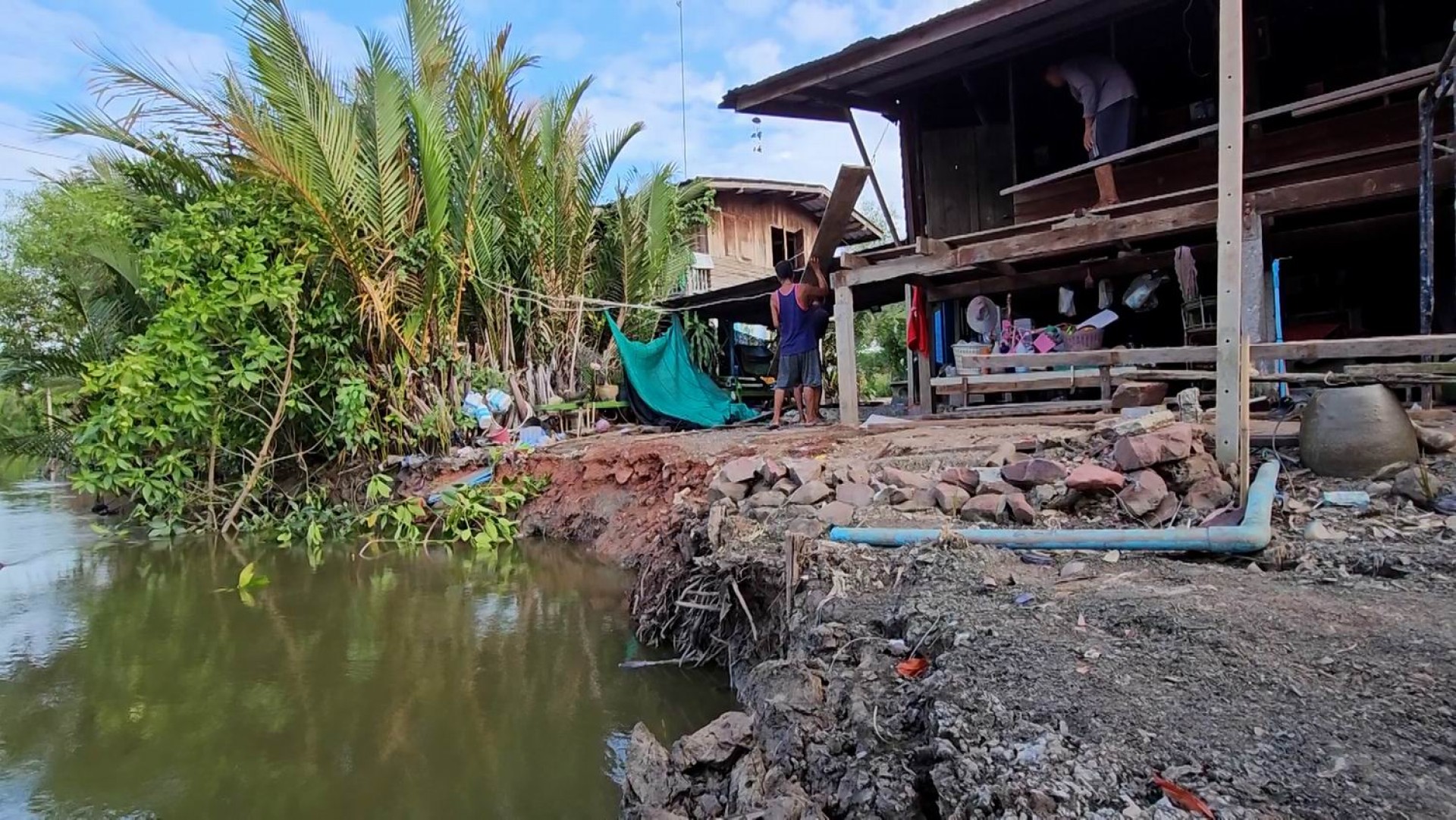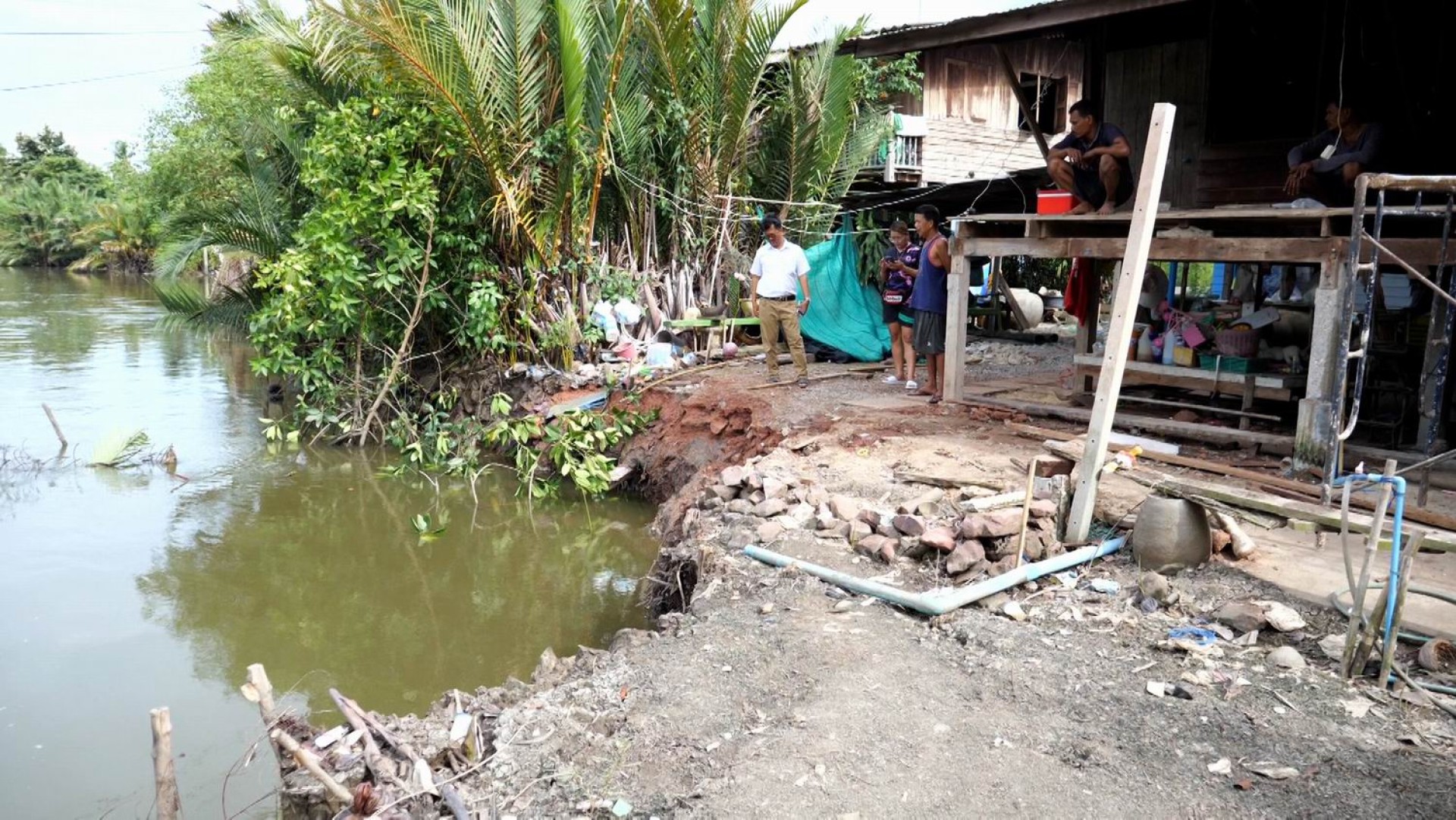 น.ส.ชาลินี กล่าวว่า เดิมที่ดินผืนนี้มีประมาณ 1 ไร่เศษ ตั้งแต่เกิดมาก็เห็นผืนดินอยู่ในแนวป่าจาก ต่อมาน้ำกัดเซาะไปเรื่อยๆ จนปัจจุบันพังลงไปในคลองหมดแล้ว ซึ่งที่ผ่านมาบิดาตนก็ใช้เงินหลายหมื่นบาท ซื้อไม้ไผ่โคนซอปักเป็นแนวกันตลิ่งพัง มาแล้วหลายรอบ แต่ก็เอาไม่อยู่ดินถูกน้ำกัดเซาะพังลงไปในน้ำ จนต้องรื้อบ้านถอยร่นมาแล้ว ล่าสุดดินก็ยังพังมาถึงตัวบ้าน บิดาตนจึงรื้อบ้านบริเวณที่ใกล้ดินพังออกอีกครั้ง เพื่อป้องกันให้เกิดอันตราย