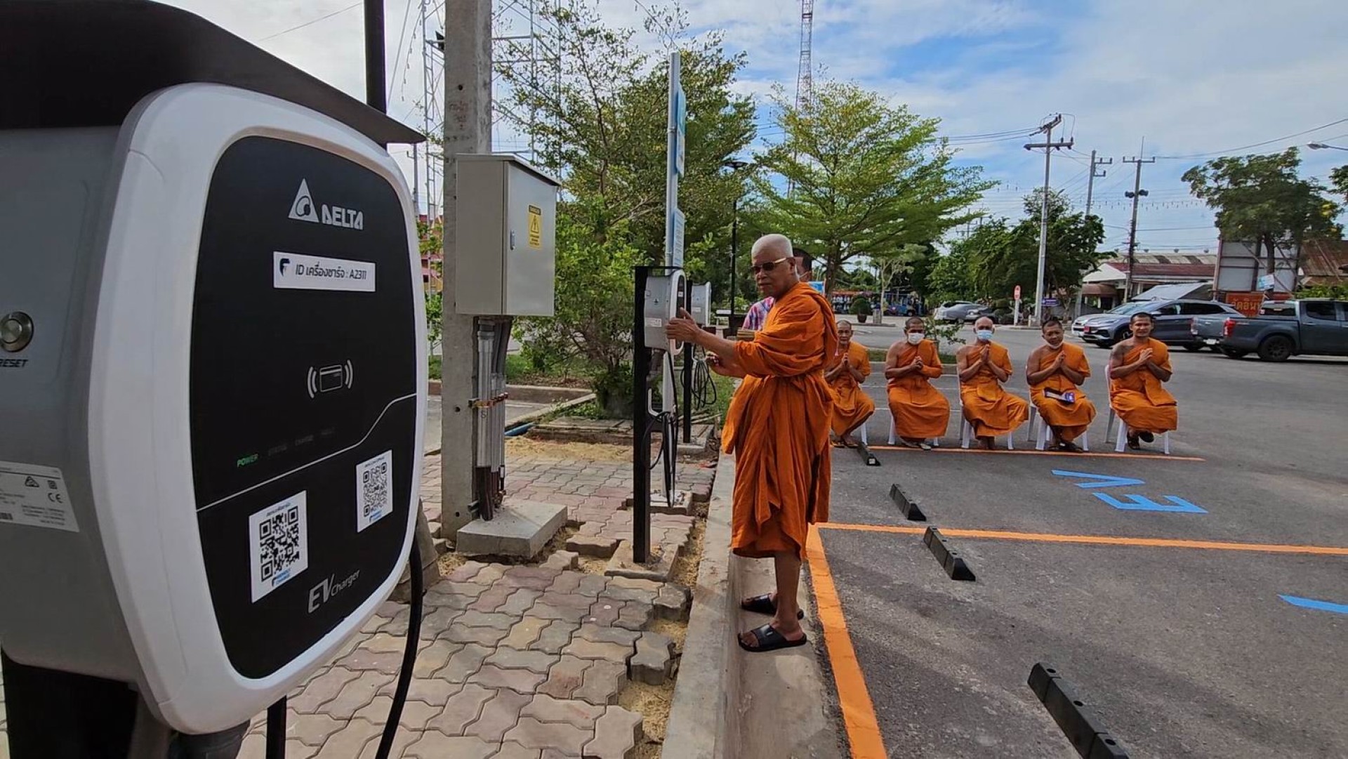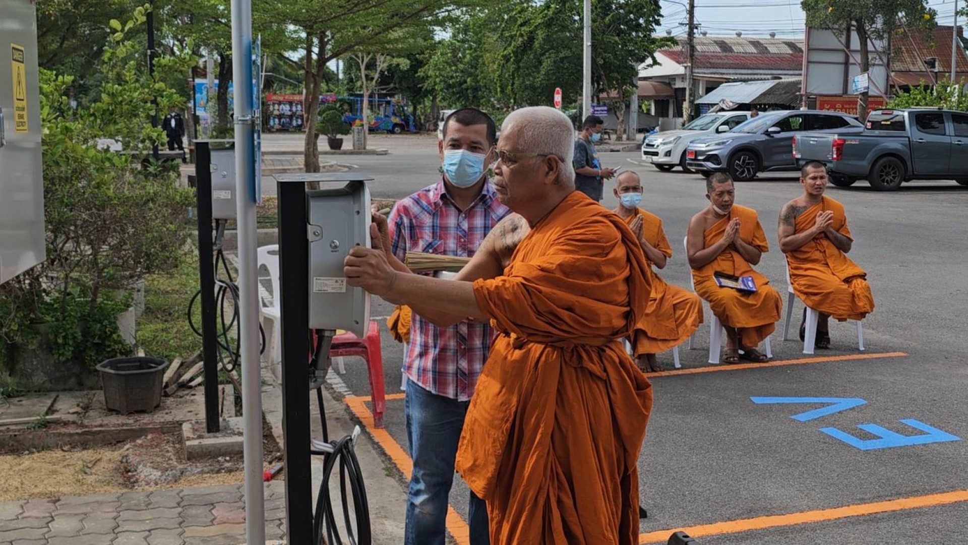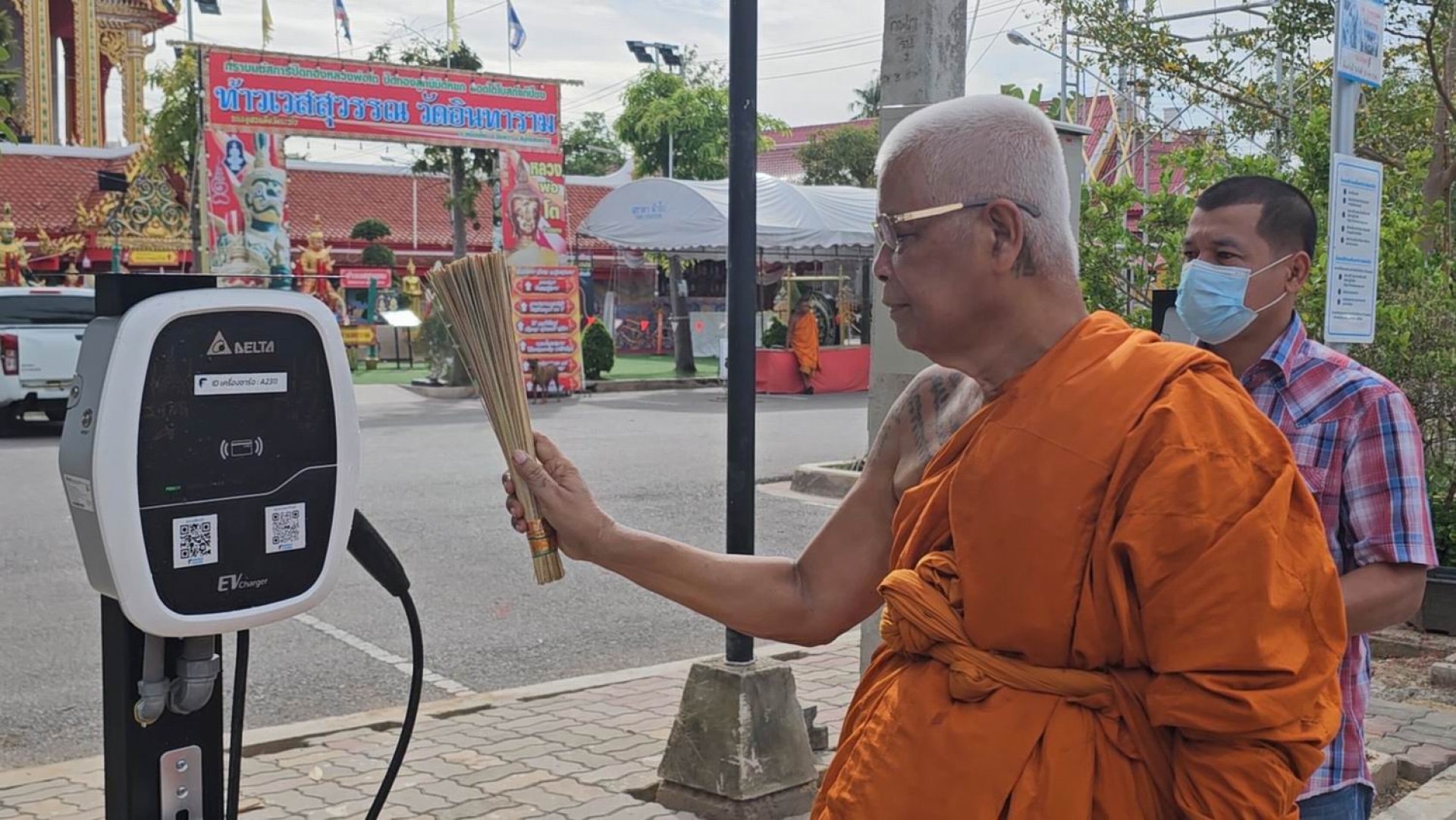 ที่วัดอินทาราม ตำบลเหมืองใหม่ อำเภออัมพวา จังหวัดสมุทรสงคราม พระครูพิศิษฏ์ประชานาถ หรือ ดร.หลวงพ่อแดง นันทิโย รองเจ้าคณะอำเภออัมพวา เจ้าอาวาสวัดอินทาราม ต.เหมืองใหม่ อ.อัมพวา จ.สมุทรสงคราม ที่ปรึกษาคณบดีคณะสังคมศาสตร์ มหาจุฬาลงกรณ์ราชวิทยาลัย เป็นประธานเจิม และพรมน้ำมนต์ สถานีชาร์จรถไฟฟ้าภายในวัดแห่งแรกและแห่งเดียวในไทย โดยมีพระสงฆ์ 5 รูป เจริญพระพุทธมนต์ เพื่อความเป็นสิริมงคล