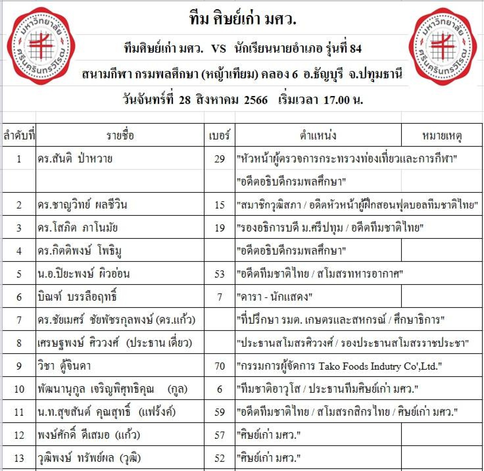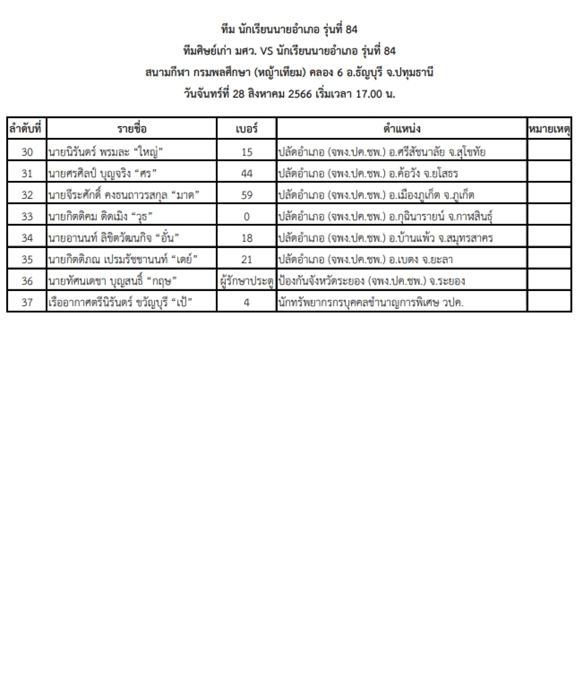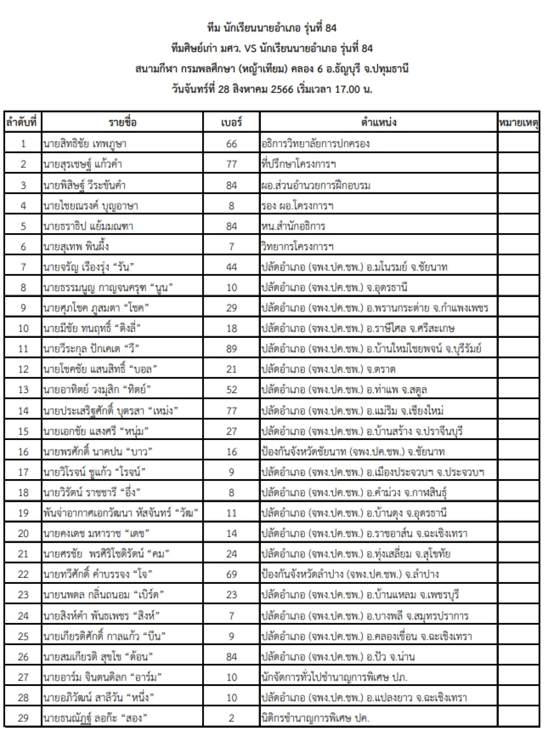 เมื่อวันที่ 28สิงหาคม 2566 ได้มีการจัดการแข่งขัน FRIENDLY MATCH DAY ศิษย์เก่า มศว. VS นักเรียนนายอำเภอ รุ่นที่84 ณ.สนามกรมพลศึกษา คลอง6 เวลา 17.00 น. โดย ดร.สันติ ป่าหวาย ประธานจัดงาน พัฒนานุกูล เจริญพิศุทธิคุณ (กุล) เลขานุการจัดงาน น.ท. สุขสันต์ คุณสุทธิ์ (แฟร้งค์) หัวหน้าผู้ฝึกสอน โดยมี