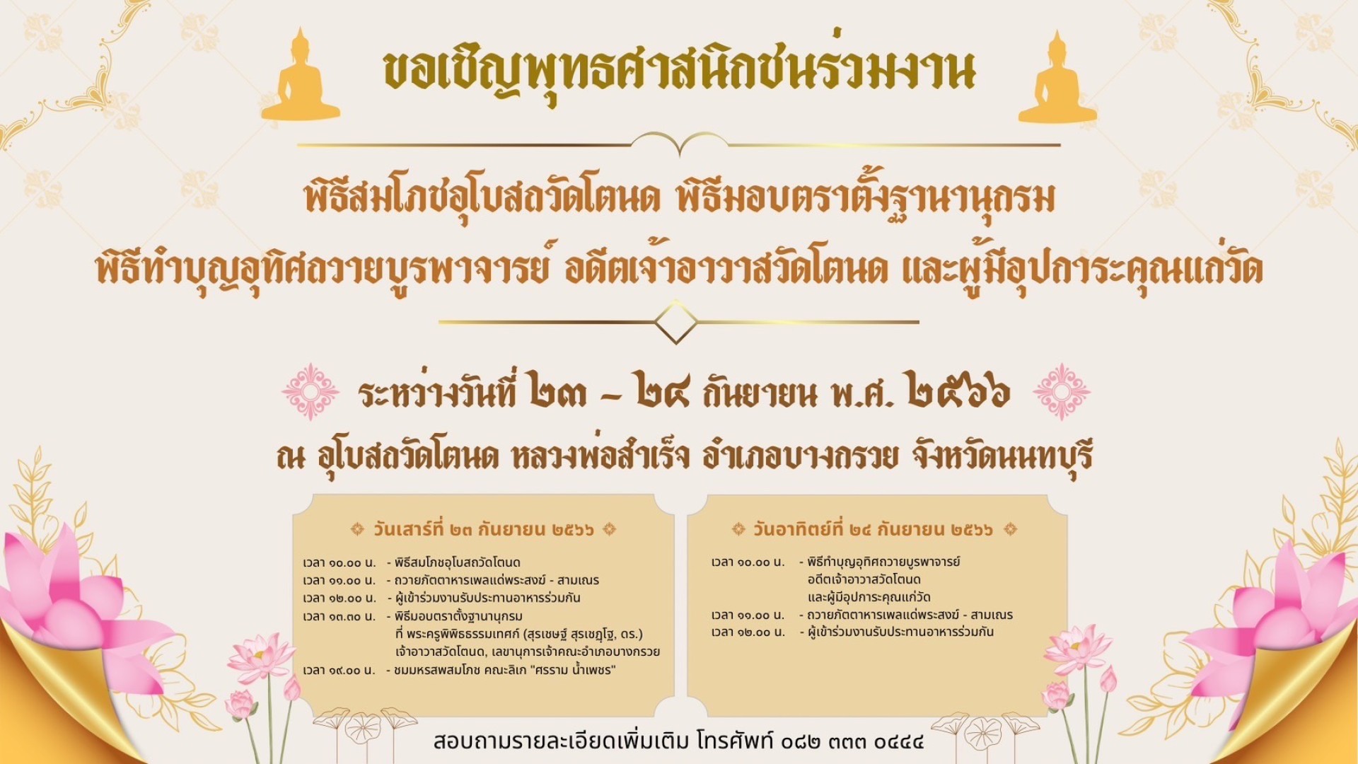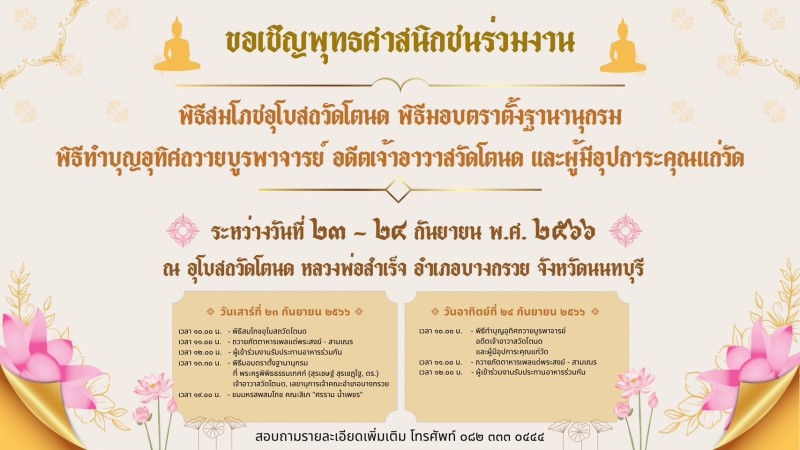 ขอเชิญพุทธศาสนิกชนร่วมงาน พิธีสมโภชอุโบสถวัดโตนด