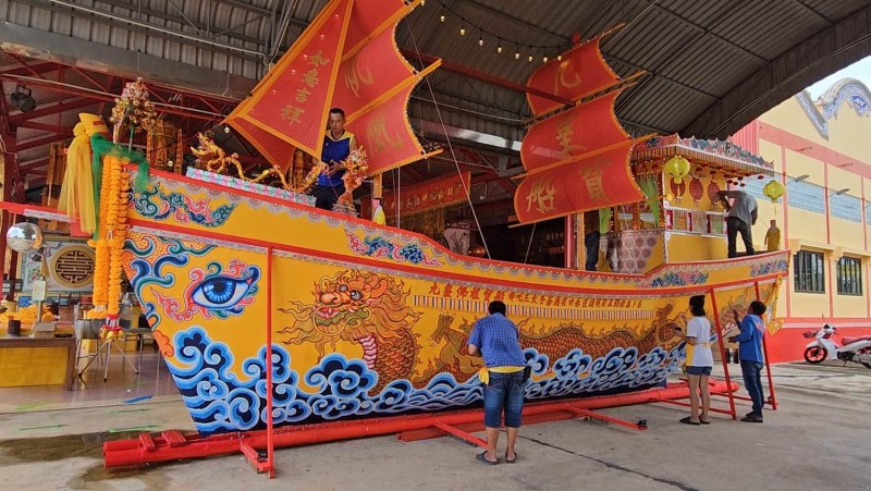 ผู้สื่อข่าวรายงานบรรยากาศการเตรียมความพร้อมเทศกาลกินเจปี 2566 ตรงกับวันที่ 14 - 23 ตุลาคม 2566 ที่ศาลเจ้านาจาซาไท้จื้อเอี้ยกง ต.บ้านปรก อ.เมือง จ.สมุทรสงคราม ว่า เป็นไปอย่างคึกคัก ศิษยานุศิษย์ได้พร้อมใจกันสร้างเรือสำเภาเทพเจ้าที่ใหญ่ที่สุดในจังหวัดสมุทรสงคราม และคาดว่าจะใหญ่ที่สุดในไทย ขนาดกว้างเกือบ 3 เมตร ยาว 10 เมตร สูง 6 เมตร มูลค่าเกือบ 2 แสนบาท เพื่อให้ชาวไทยและชาวไทยเชื้อสายจีนที่ร่วมพิธีถือศีลกินเจได้กราบไหว้และส่งเทพเจ้ากิ่วฮ้วงฮุดโจ้ว กลับสู่สรวงสวรรค์ในวันที่ 23 ตุลาคม เวลา 23.09 น. โดยเผาเครื่องถวายเทพเจ้าพร้อมเรือในคลองแม่กลองซึ่งแต่ละปีรวมมูลค่าเกือบ 1 ล้านบาท