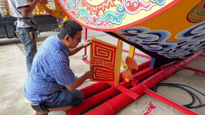 นายสุวโรจน์ ถิรธนาเจริญวงศ์ ประธานศาลเจ้านาจาซาไท้จื้อเอี๊ยกง กล่าวว่า สำหรับปีนี้ทางศาลเจ้าได้ตกแต่งลวดลายเรือเป็นรูปมังกรเนื่องจากมังกรนั้นเป็นสัญลักษณ์ของพระมหากษัตริย์จีน หมายถึงความอุดมสมบูรณ์ โดยปีนี้มีความเป็นพิเศษที่บริเวณเก๋งเรือ จะเปิดโล่งให้แสงสว่างส่องเข้าด้านใน ประดับตบแต่งเป็นม่านผ้าลูกไม้ให้สวยงาม รวมทั้งยังมีโคมไฟประดับโดยรอบเก๋ง ให้แสงสว่าง นำพาลูกศิษย์ หรือ เจอิ้วที่มาร่วมถือศีลกินเจ มีความเจริญรุ่งเรือง เดินทางปลอดภัย สว่างไสวตลอดไป ด้านท้ายเรือเขียนหนังสือจีนตัว “หก” คือบุญวาสนา เพื่อให้ท่านที่มีกราบไหว้เทพเจ้ากิ้วฮ้วงฮุดโจ้วมีวาสนา เจริญรุ่งเรือง ประสบความสำเร็จ ใบเรือเขียนว่า “ไฉ่เต็งปู้กุ่ย” คือ แสงสว่างมีโชคลาภ และ กิ๋วฮ้วง ป๋อจุ๊ แปลว่าเรือสำเภาที่ล้ำค่าอลังการ รวมทั้ง เขียนว่าเจ้กพั้งฮวงสุง แปลว่าทำกิจการอะไรก็เจริญรุ่งเรืองสำเร็จลุล่วงได้ด้วยดี ทั้งนี้เพื่อถวายกิ้วฮ้วงฮุกโจ้ว เนื่องในเทศกาลถือศีลกินเจ