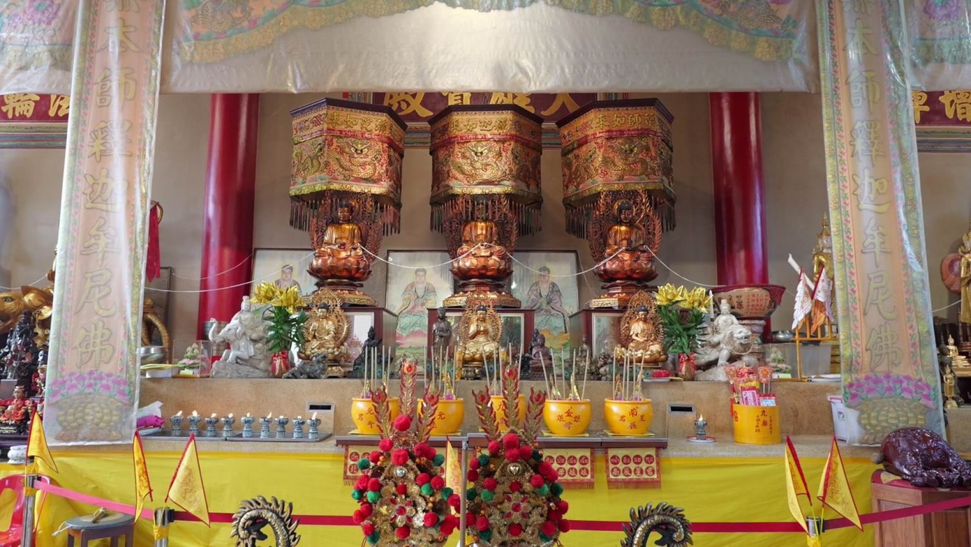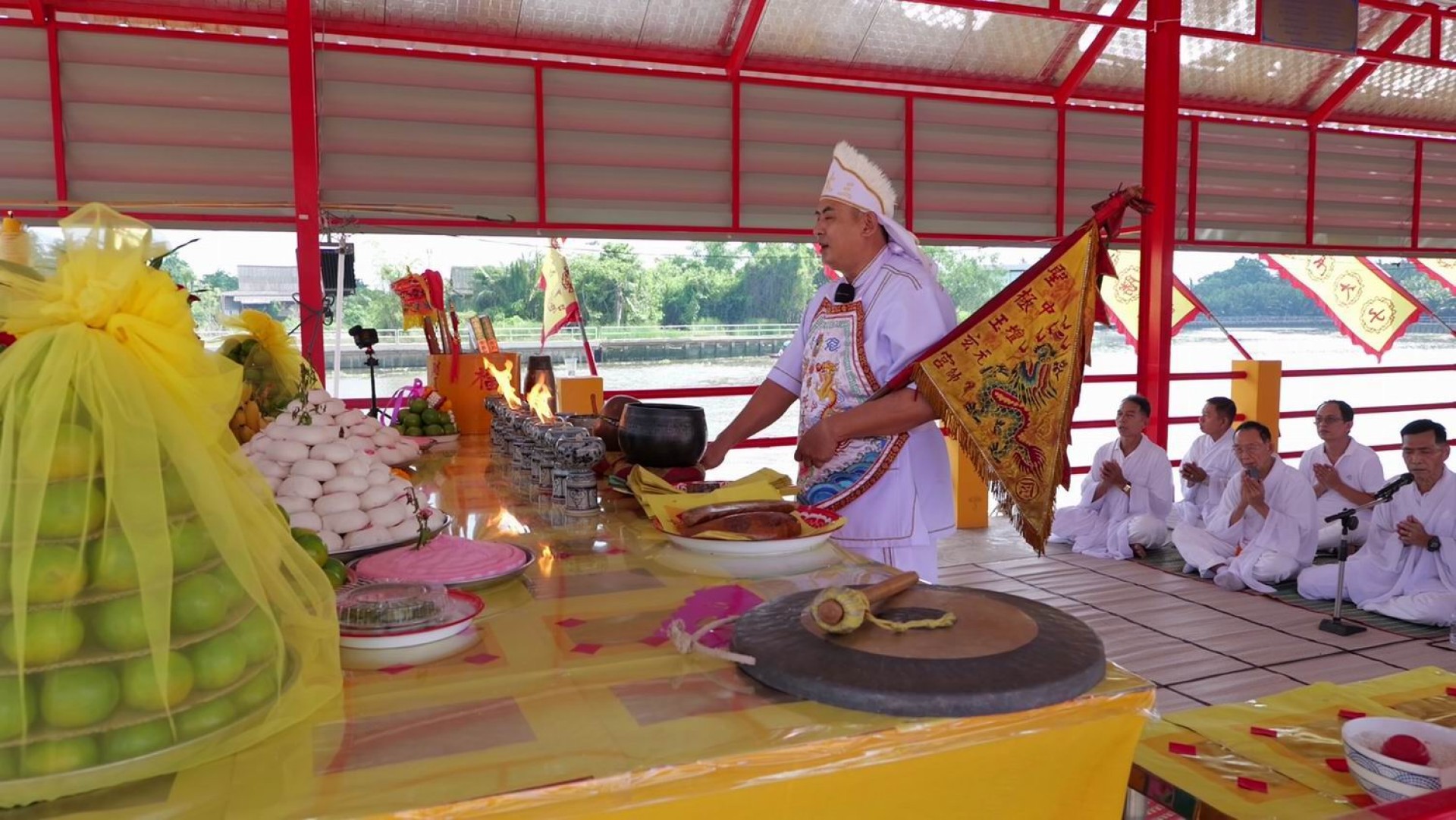 จากนั้นองค์เทพเจ้านาจาซาไท้จื่อเอี๊ยกง ได้เบิกเนตรเรือสำเภาเทพเจ้าที่ใหญ่ที่สุดในจังหวัดสมุทรสงคราม และคาดว่าจะใหญ่ที่สุดในไทย ขนาดกว้างเกือบ 3 เมตร ยาว 10 เมตร สูง 6 เมตร มูลค่าเกือบ 2 แสนบาท โดยปีนี้ได้ตกแต่งลวดลายเรือเป็นรูปมังกร เนื่องจากมังกรนั้นเป็นสัญลักษณ์ของพระมหากษัตริย์จีน หมายถึง ความอุดมสมบูรณ์ โดยปีนี้มีความเป็นพิเศษที่บริเวณเก๋งเรือ จะเปิดโล่งให้แสงสว่างส่องเข้าด้านใน ประดับตบแต่งเป็นม่านผ้าลูกไม้ให้สวยงาม รวมทั้งยังมีโคมไฟประดับโดยรอบเก๋ง ให้แสงสว่าง นำพาลูกศิษย์ หรือ เจอิ้วที่มาร่วมถือศีลกินเจ มีความเจริญรุ่งเรือง เดินทางปลอดภัย สว่างไสวตลอดไป ด้านท้ายเรือเขียนหนังสือจีนตัว “หก” คือบุญวาสนา เพื่อให้ท่านที่มีกราบไหว้เทพเจ้ากิ้วฮ้วงฮุดโจ้วมีวาสนา เจริญรุ่งเรือง ประสบความสำเร็จ ใบเรือเขียนว่า “ไฉ่เต็งปู้กุ่ย” คือ แสงสว่างมีโชคลาภ และ กิ๋วฮ้วง ป๋อจุ๊ แปลว่าเรือสำเภาที่ล้ำค่าอลังการ รวมทั้ง เขียนว่าเจ้กพั้งฮวงสุง แปลว่าทำกิจการอะไรก็เจริญรุ่งเรืองสำเร็จลุล่วงได้ด้วยดี ทั้งนี้เพื่อถวายกิ้วฮ้วงฮุกโจ้ว เนื่องในเทศกาลถือศีลกินเจ