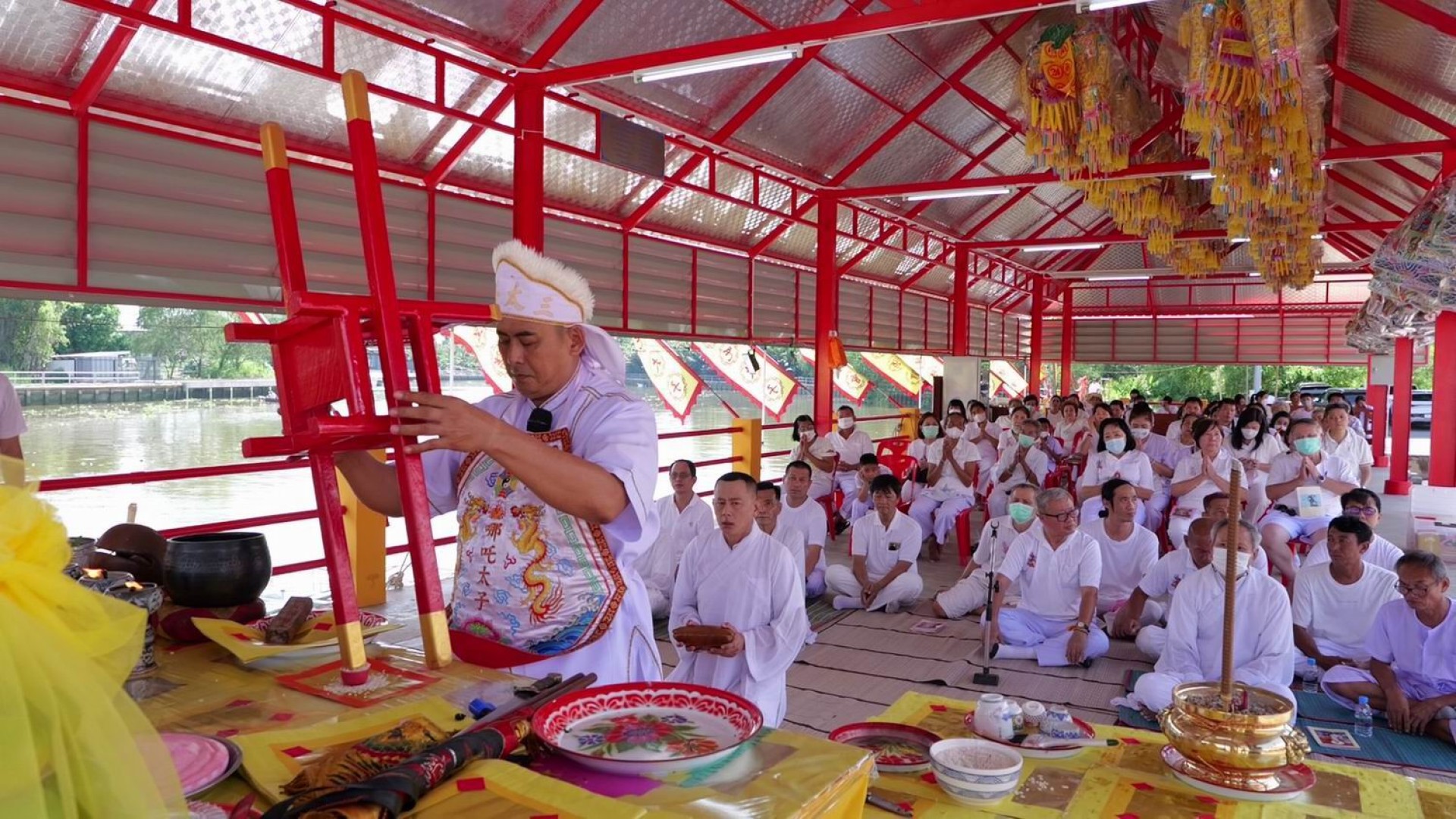 เมื่อเวลา 14 นาฬิกา 9 นาที วันที่ 14 ตุลาคม 2566 ที่ศาลเจ้านาจาซาไท้จื่อเอี๊ยกง ตำบลบ้านปรก อำเภอเมืองสมุทรสงคราม องค์เทพเจ้านาจาซาไท้จื่อเอี๊ยกง ได้นำพี่น้องชาวไทยเชื้อสายจีนที่มีจิตศรัทธาสวมใส่ชุดขาวจำนวนมาก ร่วมสวดมนต์อัญเชิญเทพเจ้ากิ้วฮ้วงฮุกโจ้, ปั๊กเต้าแชกุง, เต้าเล่าง่วนกุง, กิมบ้อเนี่ยเนี้ย และหนำซิงแชกุง มาประทับ ณ กระถางธูปทั้ง 5 กระถางก่อนจะอัญเชิญมาประทับภายในศาลเจ้า เพื่อเปิดโอกาสให้ชาวจีนและชาวไทยเชื้อสายจีนที่ร่วมเทศกาลถือศีลกินเจมาสักการะบูชาเพื่อความเป็นสิริมงคล ตลอด 10 วัน 10 คืน ระหว่างวันที่ 14 ถึง 23 ตุลาคมนี้