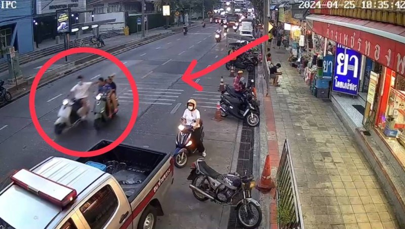 กล้องวงจรปิดจับภาพคนร้าย สวมเสื้อยืดคอกลมสีขาว กางเกงขาสั้นสีดำ ใส่แมสปิดบังใบหน้า ขี่จยย.ยี่ห้อ ฮอนด้า รุ่นจิออโน่ สีขาวดำ ไม่สวมแผ่นป้ายทะเบียน บริเวณหน้าตลาดห้วยขวาง ถนนประชาสงเคราะห์ แขวงดินแดง เขตห้วยขวาง ทำทีขับรถเข้ามาเทียบเคียงรถ จยย.ผู้เสียหาย ก่อนทำการกระชากสร้อยคอผู้เสียหายขณะขับรถจยย.กลับบ้าน ทำให้เสียหลักเกือบล้ม ก่อนขับหลบหนี ก่อนชาวบ้านระแวกนั้นช่วยกันขับตามไล่จับ