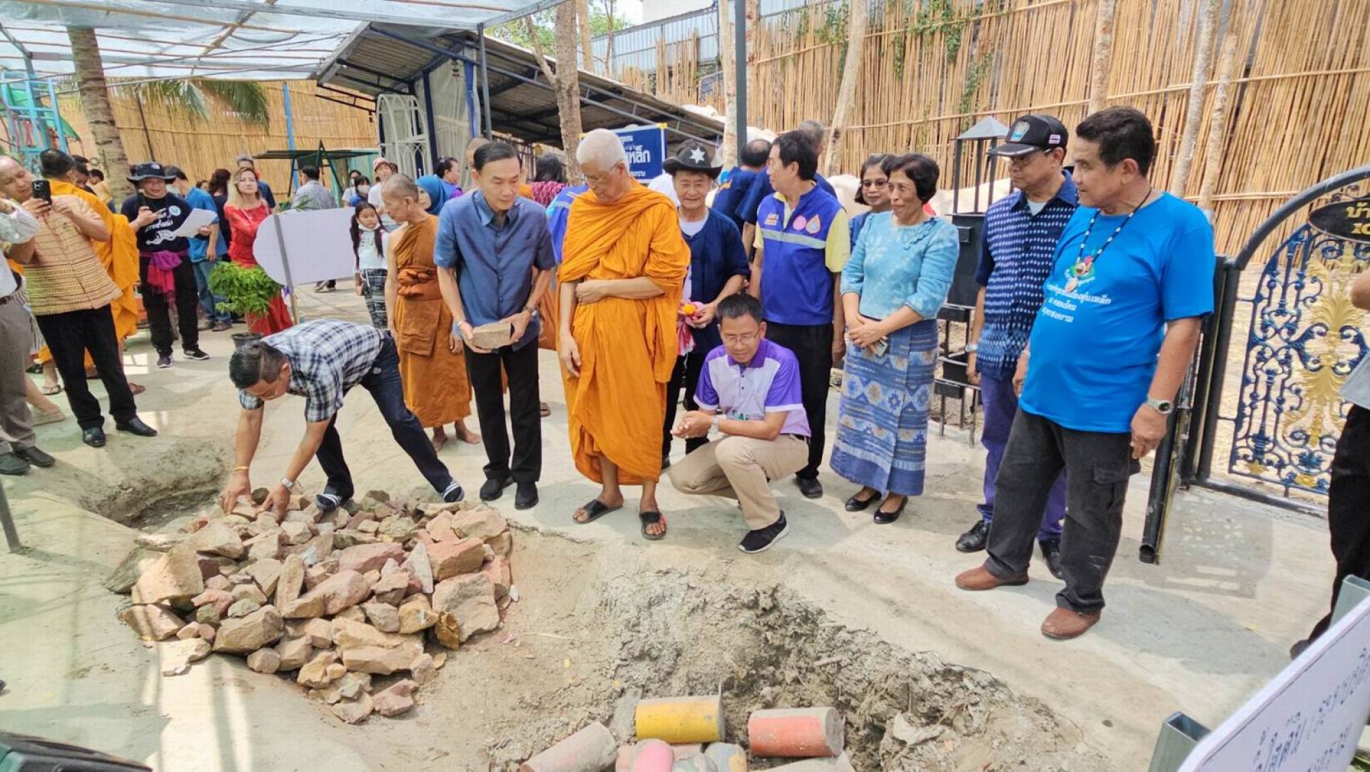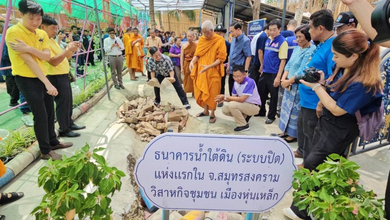 จากนั้นร่วมกันโยนก้อนหินลงในธนาคารน้ำใต้ดิน(ระบบปิด)แห่งแรกใน จ.สมุทรสงคราม ที่เปิดใช้งานอย่างเต็มรูปแบบ