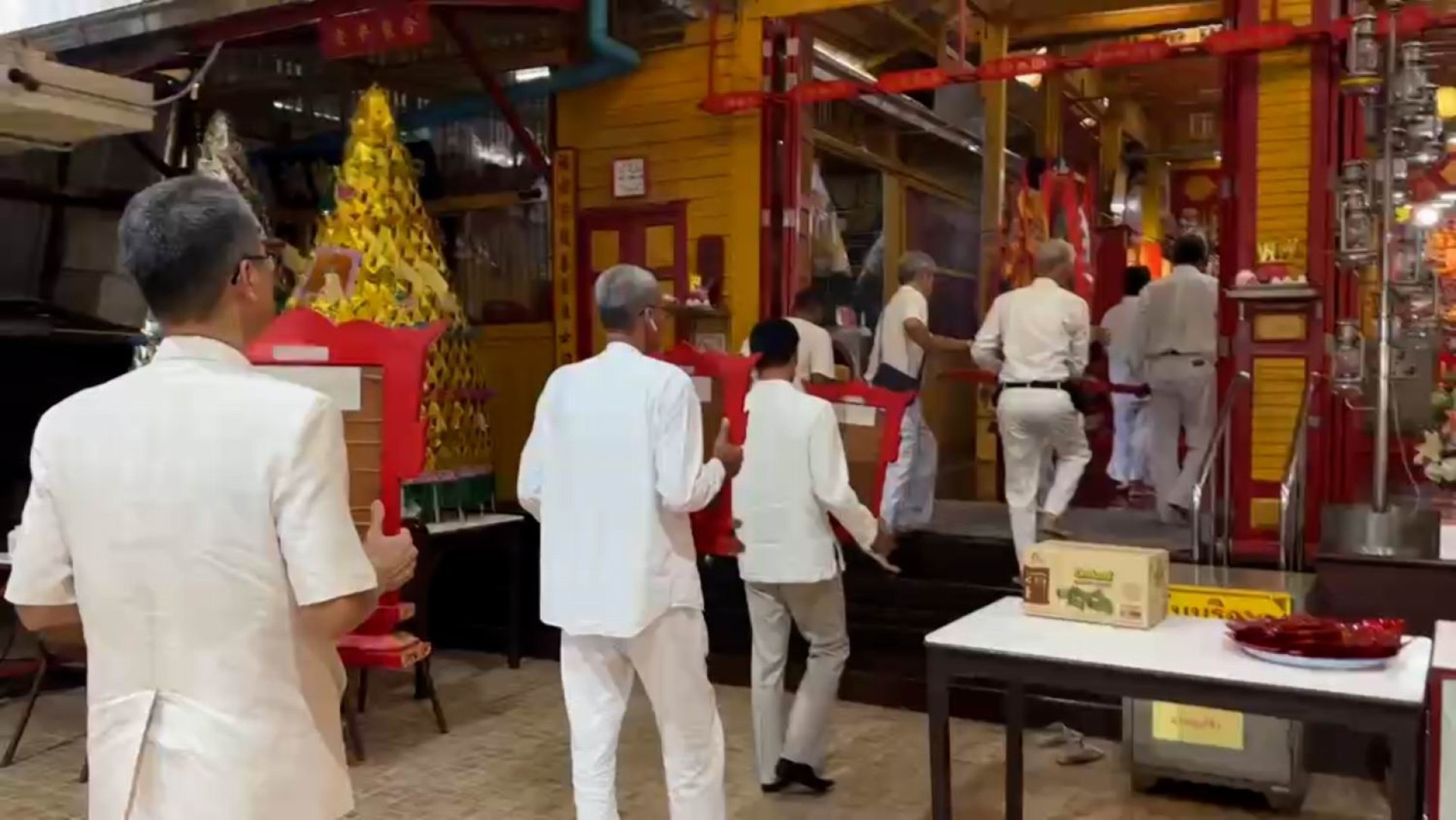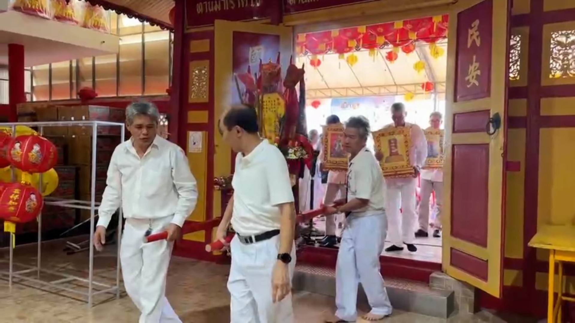 ทั้งนี้เจ้าหน้าที่ได้โยนไม้ปวย ถึง 3 ครั้ง (“ไม้ปวย” หรือ “เซ้งปวย” เป็นไม้เสี่ยงทายรูปพระจันทร์เสี้ยว ด้านหลังนูนเหมือนหลังเต่า ด้านหน้าเรียบเนียน เป็นอุปกรณ์ที่เอาไว้ใช้ติดต่อระหว่างผู้ศรัทธา (ผู้เสี่ยงทาย) กับเทพเจ้า)ต้องออกเป็น คว่ำ 1 อัน หงาย 1 อัน เทพเจ้าถึงรับลงมาประทับ ณ กระถางธูปทั้ง 5 กระถาง อัญเชิญมาประทับภายในศาลเจ้า เพื่อเปิดโอกาสให้ชาวจีนและชาวไทยเชื้อสายจีนที่ร่วมเทศกาลถือศีลกินเจมาสักการะบูชาเพื่อความเป็นสิริมงคล ตลอด 10 วัน 10 คืน ระหว่างวันที่ 2 ถึง 12 ตุลาคมนี้
