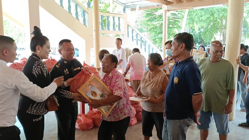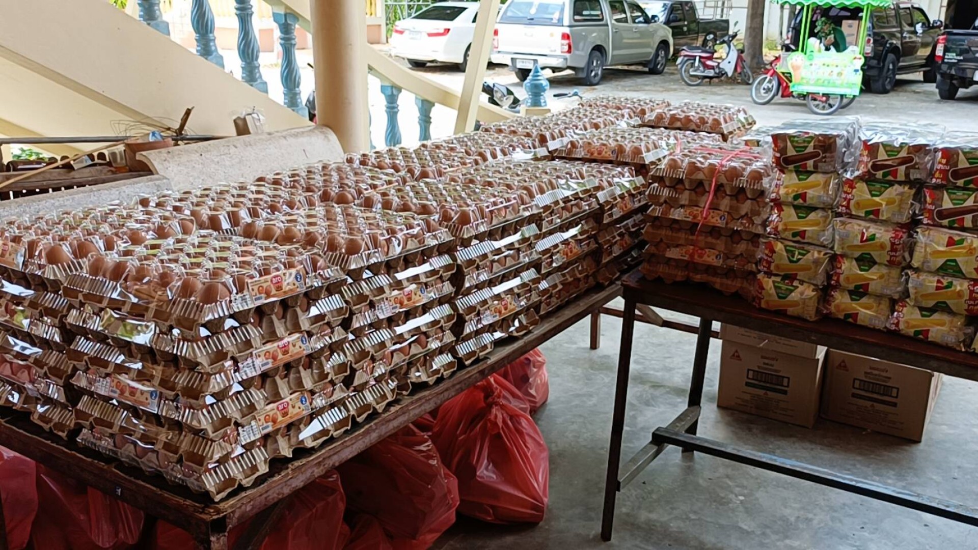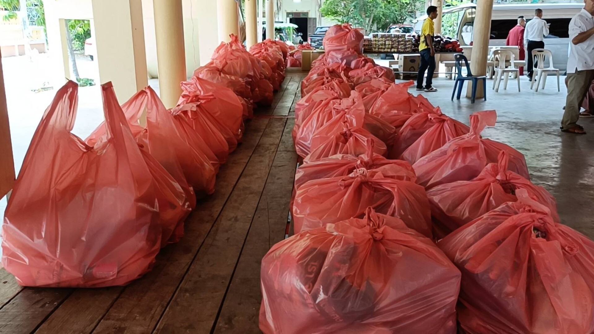 แจกถุงยังชีพ ทั้งหมด ๑๗๐ ชุด ประกอบด้วย ข้าวสาร อาหารแห้ง บะหมี่กึ่งสำเร็จรูป เส้นหมี่กึ่งสำเร็จรูป ปลากระป๋อง น้ำดื่ม ไข่ ขนมอบกรอบ ตรานมแท่ง ข้าวเกรียบกุ้งตราฟูชิ และอื่นๆ
